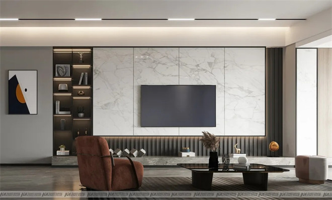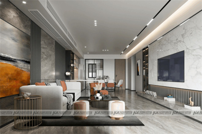 客廳的設計極具匠心,設計師通過不同材質的替換拼接及色彩搭配,為整個空間定下了精致優雅的基調賓利橙+高級灰的經典搭配,將時髦感與奢雅感引爆,撩動心弦。