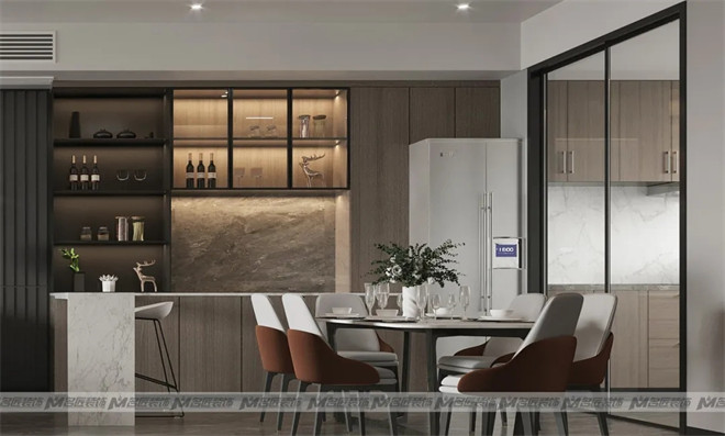客餐廳一體化設計讓空間看起來簡約大氣,也增加了家人們的互動感,餐邊柜搭配小吧臺,形成一個功能緩沖區,兼具實用及美觀