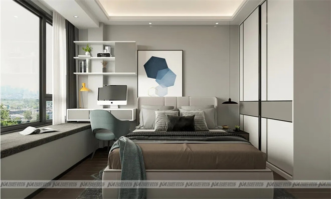 次臥的設計相比于主臥多了一分簡練,同樣低飽和的色彩搭配下增加了更多白色,讓人置身其中感受到輕松自然的氛圍