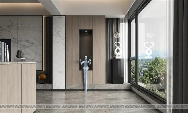 進入玄關,已然感受到彌漫在空間里的現代輕奢感,造型獨特的人物雕塑及藝術性擺件,使玄關的設計感更加充盈