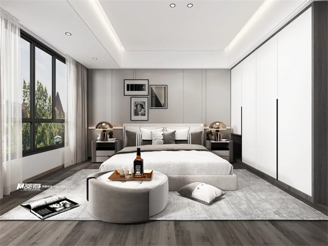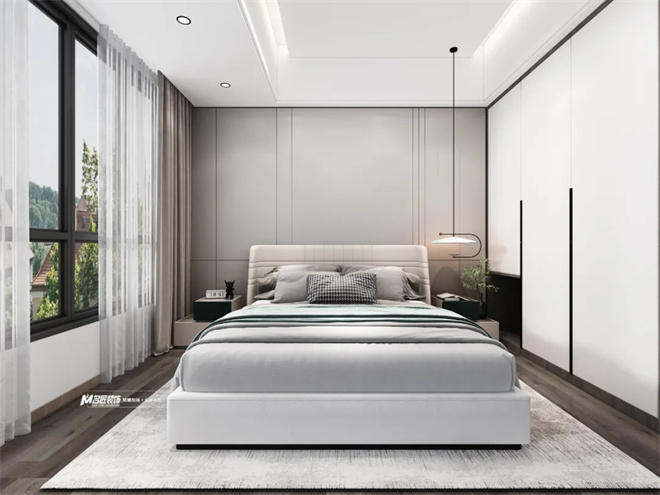臥室中色彩靈活運(yùn)用,形成自然靈動(dòng)又不失沉靜的環(huán)境,大面落地窗保證了空氣,光影與人動(dòng)線的流暢性