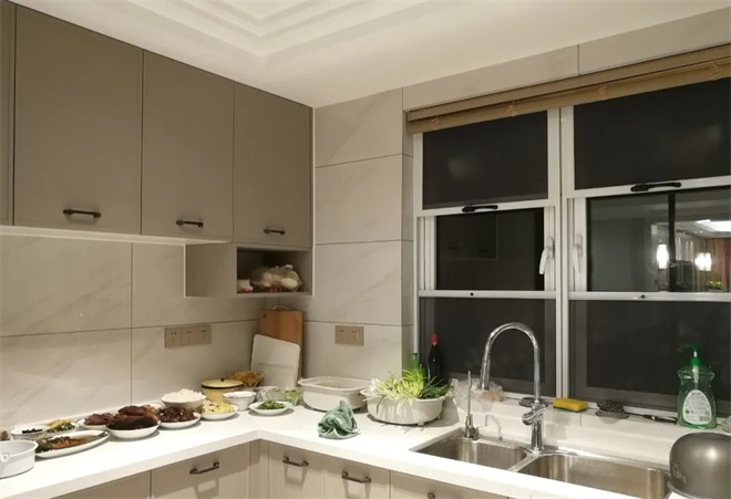 U型封閉式廚房,整體給人感覺很溫馨時尚,左側慢慢擺著即將擺上餐桌的美味佳肴,而右側水槽、操作臺、烹飪區在L拐角依次分布,動線流暢合理