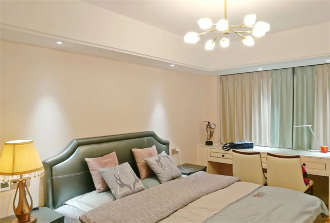 主臥墻面使用了無紡布材質,環保健康,也是時下較為流行的選擇之一,灰色的顆粒感與衣柜的米花色相搭配,冷暖融合,沉穩大氣之中,透露著居室的溫馨和溫暖